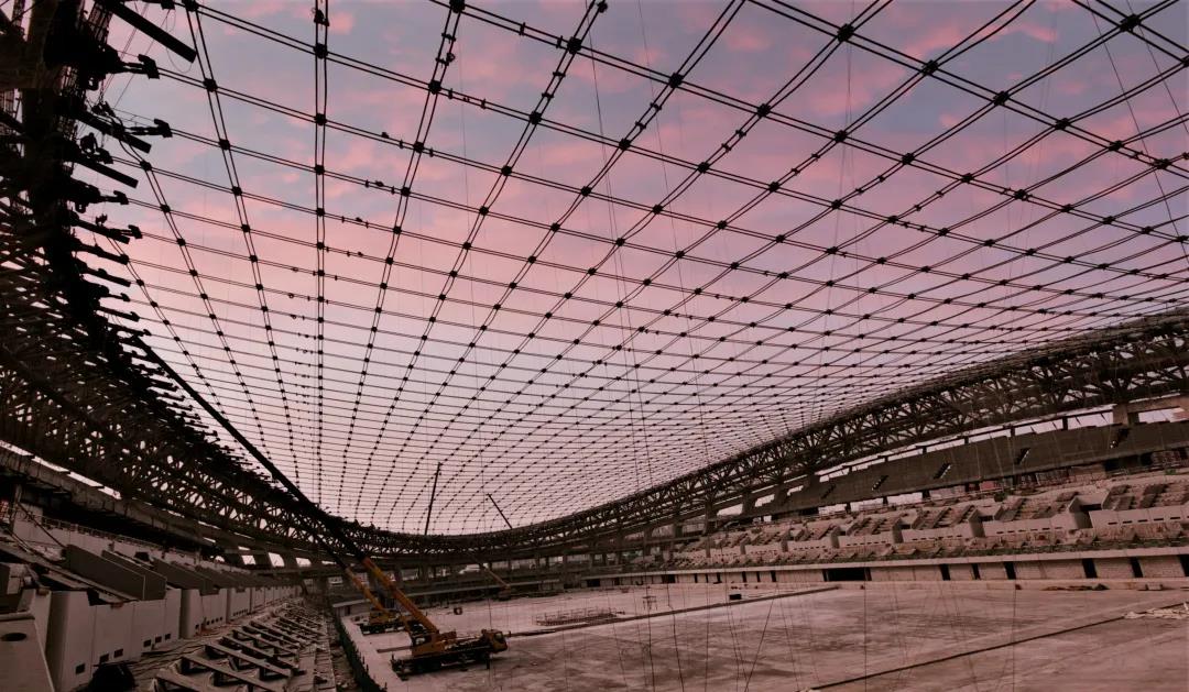 建設(shè)者通過49對(duì)承重索和30對(duì)穩(wěn)定索編織成長(zhǎng)跨198米、短跨124米的索網(wǎng)狀屋面,再鋪設(shè)1080塊4×4米單元屋面板組裝而成。由于索網(wǎng)屋面的空間形態(tài)非常復(fù)雜,張拉以后每一個(gè)“方格”空間形態(tài)都不一樣,因此填充的每一塊單元體尺寸也不同,需要通過實(shí)測(cè)得到數(shù)據(jù)后再進(jìn)行加工定制。