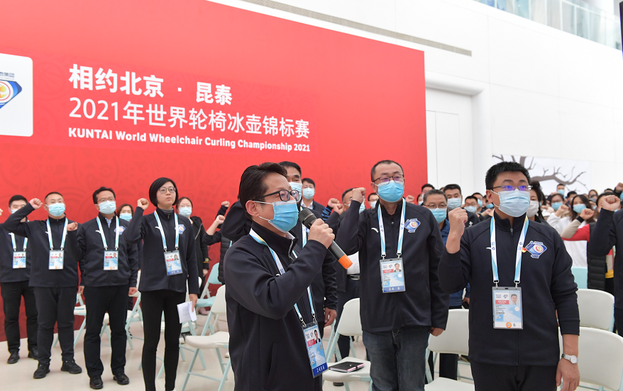 10月14日,國家游泳中心“冰立方”舉行“相約北京·昆泰2021年世界輪椅冰壺世錦賽”誓師大會(huì)。北京國資公司黨委副書記、場(chǎng)館運(yùn)行團(tuán)隊(duì)主任張杰在大會(huì)上發(fā)言并領(lǐng)誓,近300名場(chǎng)館服務(wù)保障人員代表共同宣誓,全力做好賽事服務(wù)保障工作。