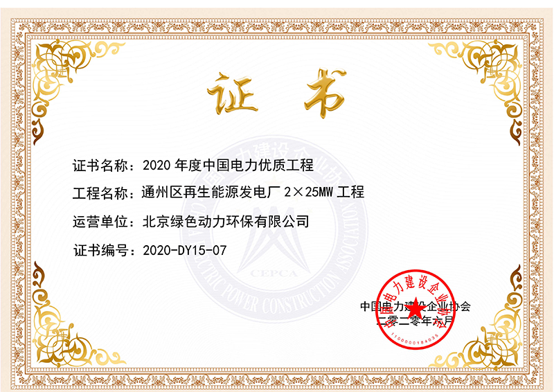 通州項目電力優(yōu)質(zhì)工程獎獲獎證書