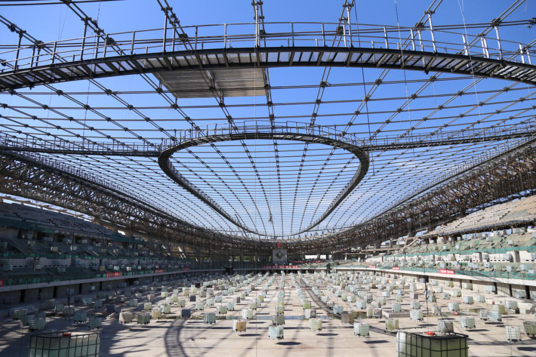 在短短的半個(gè)多月的時(shí)間里,經(jīng)歷滑移、落架、卸載等工序,橢圓形的鋼制環(huán)桁架宛如一條鋼鐵“巨龍”,以1公分之內(nèi)的誤差范圍穩(wěn)穩(wěn)地架設(shè)在主體結(jié)構(gòu)之上,工期節(jié)約了至少三個(gè)月,實(shí)現(xiàn)了基于平行施工的高效、高精度建造技術(shù)。