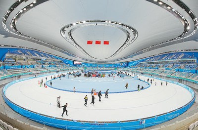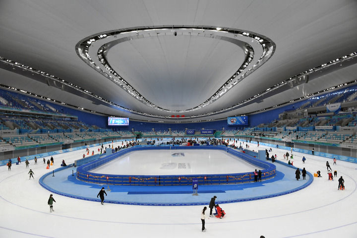 1月22日是農(nóng)歷正月初一,人們來到國家速滑館“冰絲帶”滑冰,樂享新春假期。