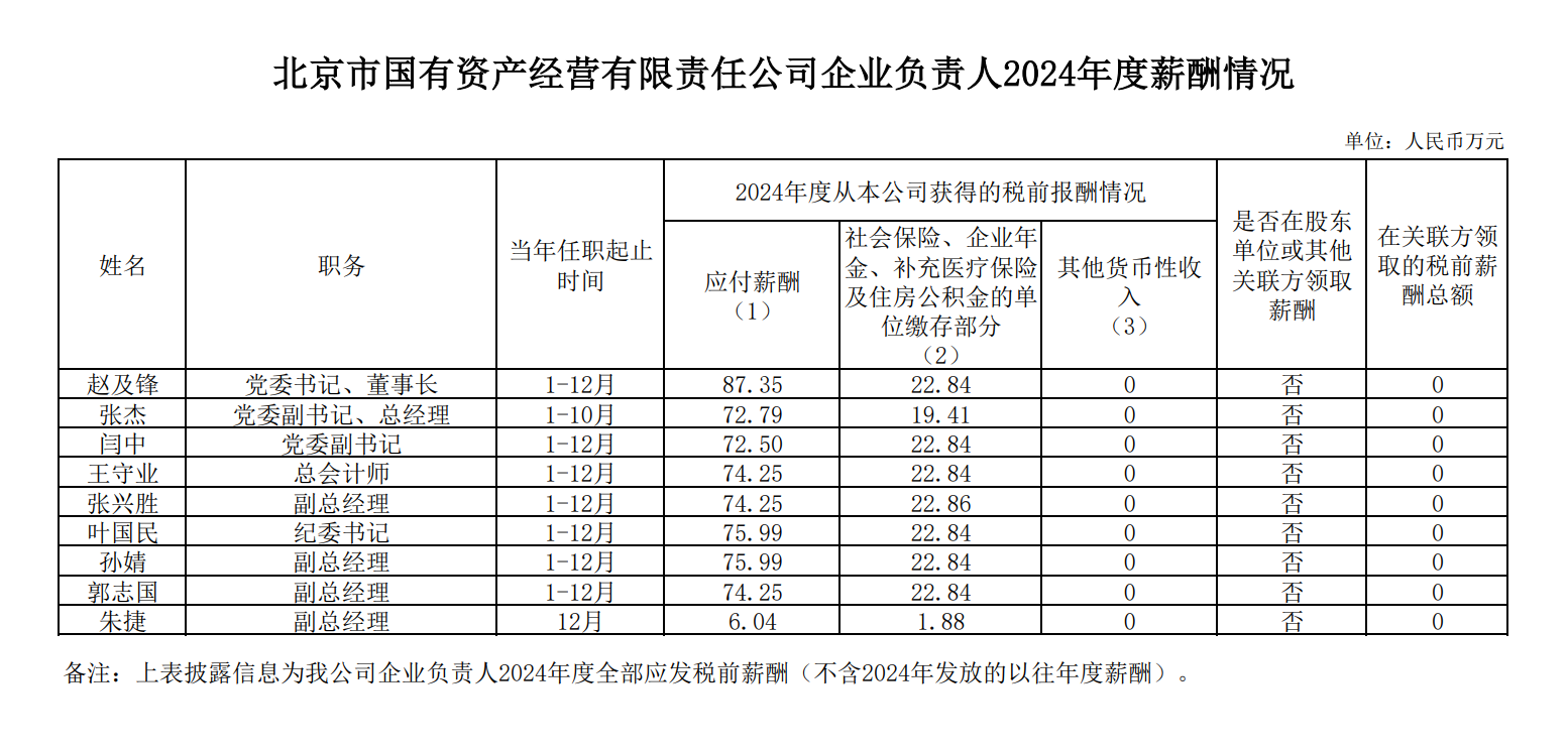北京市國(guó)有資產(chǎn)經(jīng)營(yíng)有限責(zé)任公司企業(yè)負(fù)責(zé)人2024年度薪酬情況