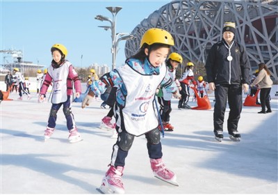 1月15日,北京第二屆“相約2022”冰雪文化節(jié)舉辦“攜手未來 圓夢冰雪”主題公益活動專場,邀請來自北京偏遠(yuǎn)地區(qū)的300余名中小學(xué)生免費(fèi)體驗(yàn)冰雪運(yùn)動,傳播奧林匹克文化,助力“三億人參與冰雪運(yùn)動”。圖為孩子們正在“鳥巢”前學(xué)習(xí)滑冰。