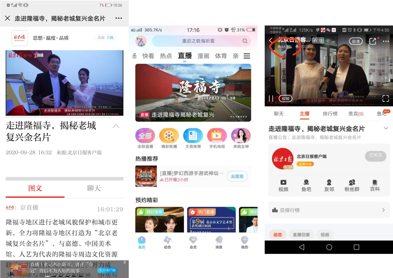 此次直播在北京日報客戶端京直播,北京日報及北京晚報微博直播,北京日報旗下的頭條、百家號、抖音直播、快手直播、斗魚直播,以及聯(lián)合新浪新聞客戶端、優(yōu)酷、長安街知事微博、北京日報百家號、都市現(xiàn)場微博、中搜搜悅、YY直播、KK直播等十余個視頻直播平臺播出,截至目前,總播放量已超過215萬次。直播內(nèi)容全程“高能”,收獲大批網(wǎng)友的關(guān)注和點贊。