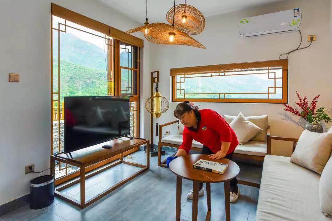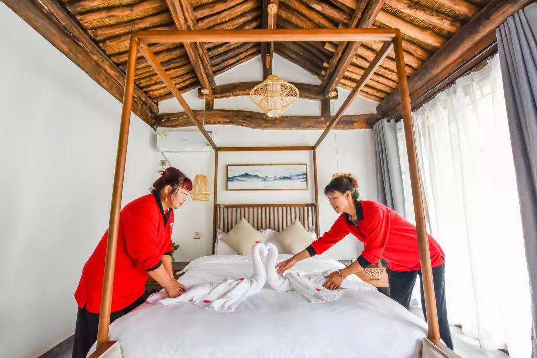 剛才提到的孫大姐,現(xiàn)在如愿地有了穩(wěn)定的工作——創(chuàng)藝鄉(xiāng)居精品民宿管家,經(jīng)過培訓(xùn),她已經(jīng)可以在5分鐘內(nèi)換好床單、被罩、枕芯所有床品,還會把毛巾疊出栩栩如生的小動物。她說,以前總覺得自己低人一頭,現(xiàn)在有了穩(wěn)定工作送到咱家門口,有了份工作,收入不僅翻了倍,而且活的更有價值和尊嚴(yán)了。