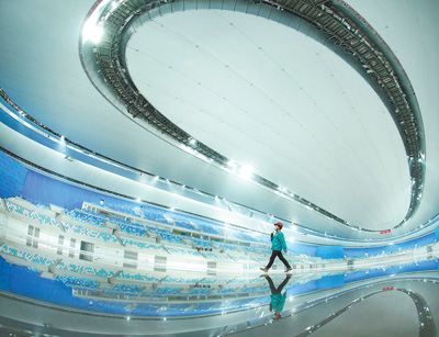圖為一名工人在剛剛完工的國(guó)家速滑館里走過(guò)。