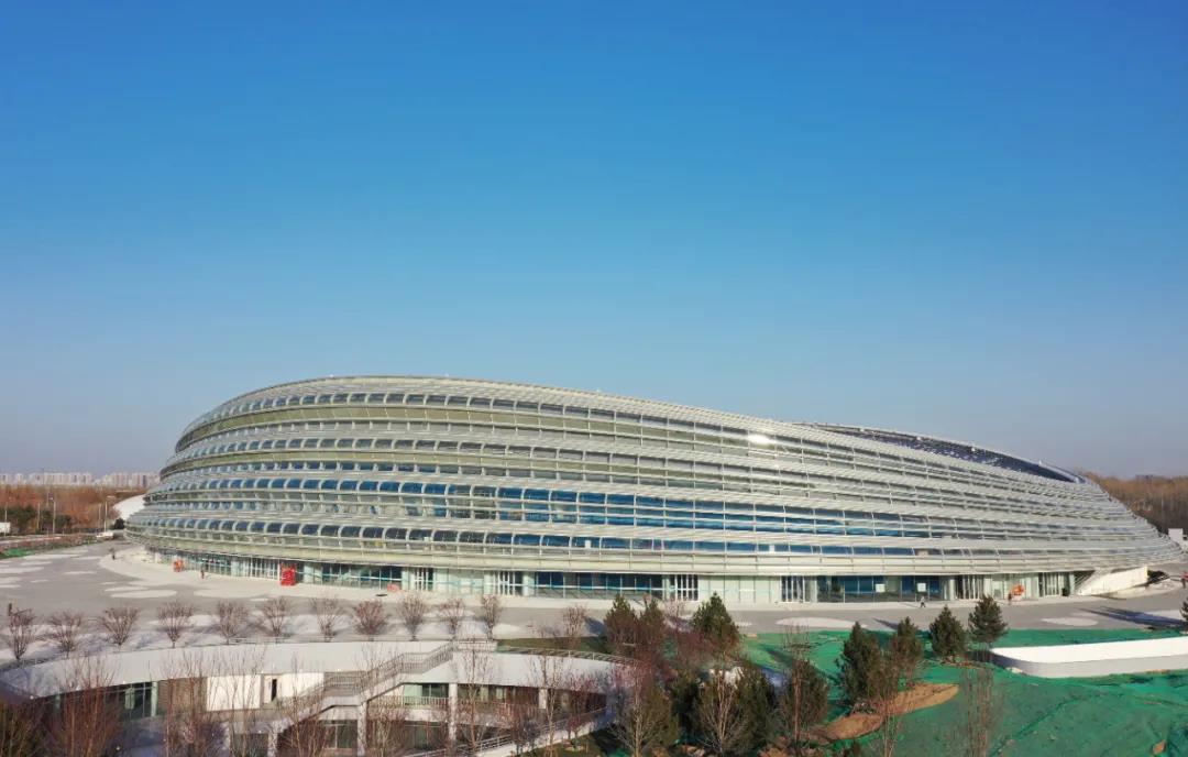 這種創(chuàng)新型“冰絲帶”狀曲面玻璃幕墻的設計靈感來自冰雪運動與速度的結合。盤旋的“冰絲帶”象征著速度滑冰運動員高速滑進時冰刀留下的軌跡,22條“冰絲帶”又象征著在2022年舉辦北京冬奧會。