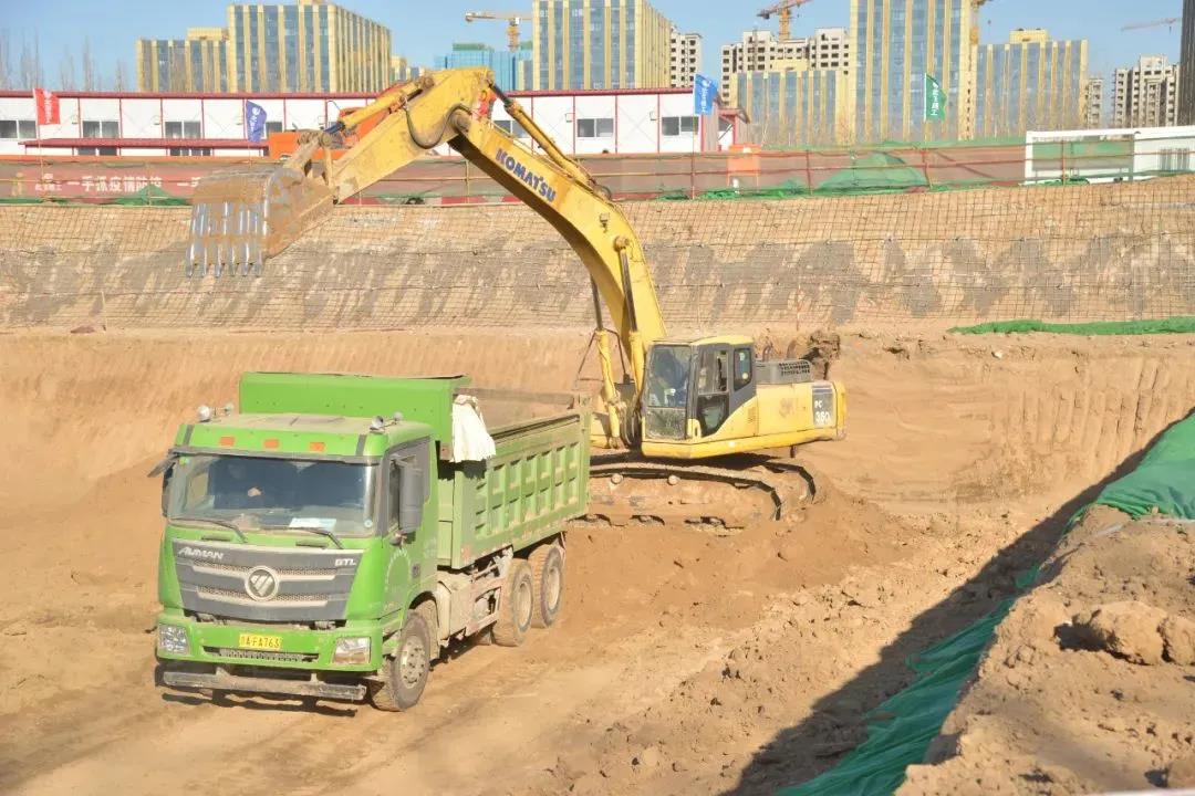 工程現(xiàn)場(chǎng),多輛挖掘機(jī)及土方車投入作業(yè),佩戴著安全帽和口罩的工人們正熱火朝天地進(jìn)行土方開挖工作。
