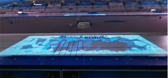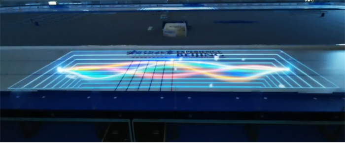 本次比賽中體育展示團(tuán)隊(duì)在視頻制作和賽場(chǎng)投影中高質(zhì)量完成了速滑測(cè)試賽總片頭、速滑屏幕主視覺、頒獎(jiǎng)儀式動(dòng)態(tài)畫面,以及裸眼3D視效呈現(xiàn)的冰面投影展示。數(shù)字內(nèi)容圍繞速度、熱情、動(dòng)感、冰雪、速滑館等中國(guó)元素,介紹賽事及運(yùn)動(dòng)員信息,展現(xiàn)速度滑冰及運(yùn)動(dòng)員的魅力,通過(guò)炫酷特效打造極具震撼的視覺沖擊力,激發(fā)觀眾對(duì)于后續(xù)比賽的期待和憧憬,在測(cè)試賽中更好地展示中國(guó)文化。