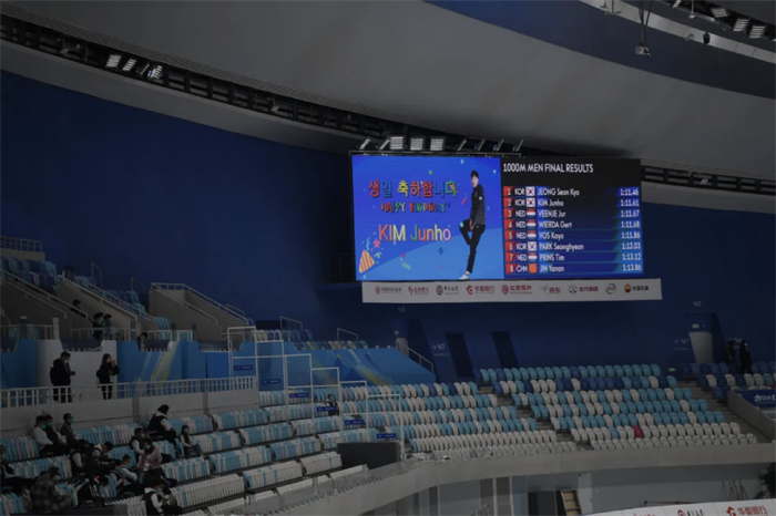 作為賽場(chǎng)上的氣氛擔(dān)當(dāng),比賽期間體育展示團(tuán)隊(duì)還不斷挖掘各種現(xiàn)場(chǎng)亮點(diǎn)。當(dāng)?shù)弥?0月9日是來(lái)自韓國(guó)的參賽選手金俊昊26歲的生日時(shí),體育展示團(tuán)隊(duì)第一時(shí)間和場(chǎng)館制作人溝通、制定方案,協(xié)調(diào)運(yùn)動(dòng)員服務(wù)組和志愿者團(tuán)隊(duì)確認(rèn)現(xiàn)場(chǎng)生日祝福呈現(xiàn)形式。比賽當(dāng)天,在金俊昊所參加的男子1000米比賽結(jié)束后,“冰絲帶”內(nèi)響起了韓語(yǔ)生日歌,現(xiàn)場(chǎng)大屏幕上也顯示出中文、韓文和英文三種語(yǔ)言版本的生日祝福,獻(xiàn)上了一份意外又暖心的生日驚喜。