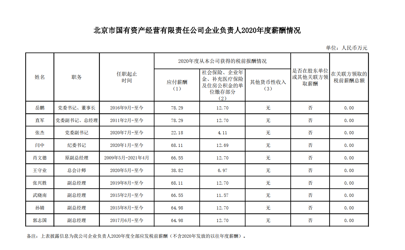 北京國資公司2020年度企業(yè)負(fù)責(zé)人薪酬信息公開