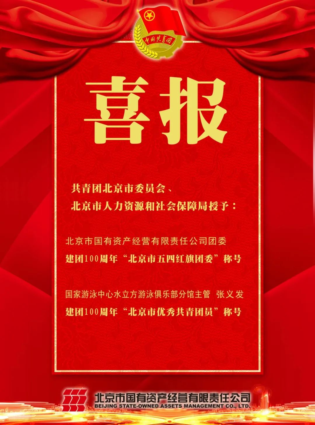 日前,建團100周年北京市先進組織和先進個人評選結(jié)果揭曉。共青團北京市委員會、北京市人力資源和社會保障局授予國資公司團委建團100周年“北京市五四紅旗團委”稱號,授予國家游泳中心水立方游泳俱樂部分館主管張義發(fā)建團100周年“北京市優(yōu)秀共青團員”稱號。