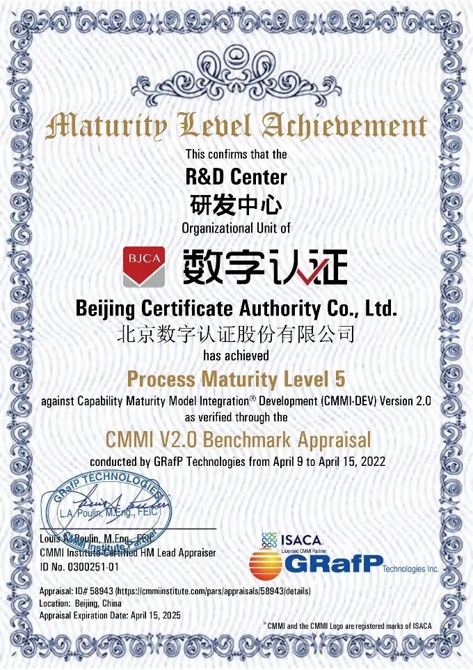 近日,北京國資公司所屬數(shù)字認(rèn)證公司(以下簡稱“數(shù)字認(rèn)證”)順利通過全球軟件領(lǐng)域難度最大、規(guī)格最高的軟件開發(fā)能力成熟度認(rèn)證CMMI 5評估,并獲得權(quán)威機構(gòu)頒發(fā)的CMMI 5級證書。