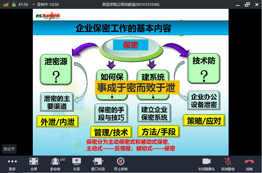 本次培訓(xùn)邀請國內(nèi)知名競爭情報、反情報和管理專家,中國競爭情報實戰(zhàn)派首要代表,被譽為中國“商業(yè)007”的張世平教授,圍繞企業(yè)秘密的保護與保密工作操作方法,重點講解了企業(yè)泄密的主要途徑和竊密的主要手段、商業(yè)泄密的保護與防范措施。