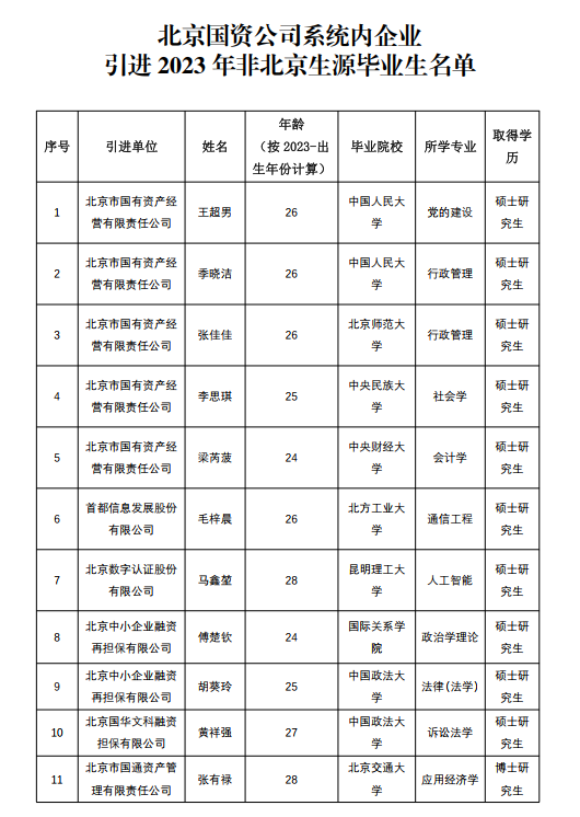 北京國(guó)資公司系統(tǒng)內(nèi)企業(yè)引進(jìn)2023年非北京生源畢業(yè)生的公示