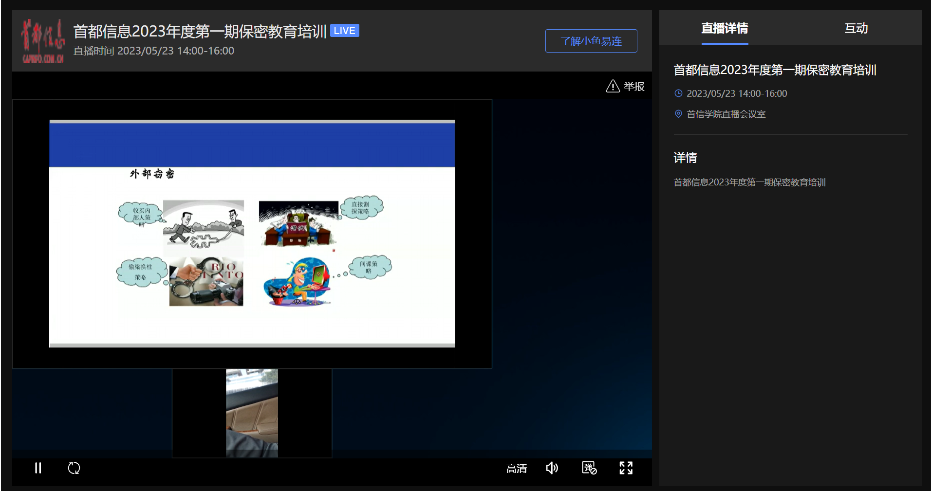 5月23日下午,保密辦公室聯(lián)合首信學(xué)院,通過首信學(xué)院云直播會(huì)議室,面向全體員工開展了公司2023年度第一期保密教育培訓(xùn),共900余人參加了培訓(xùn)。