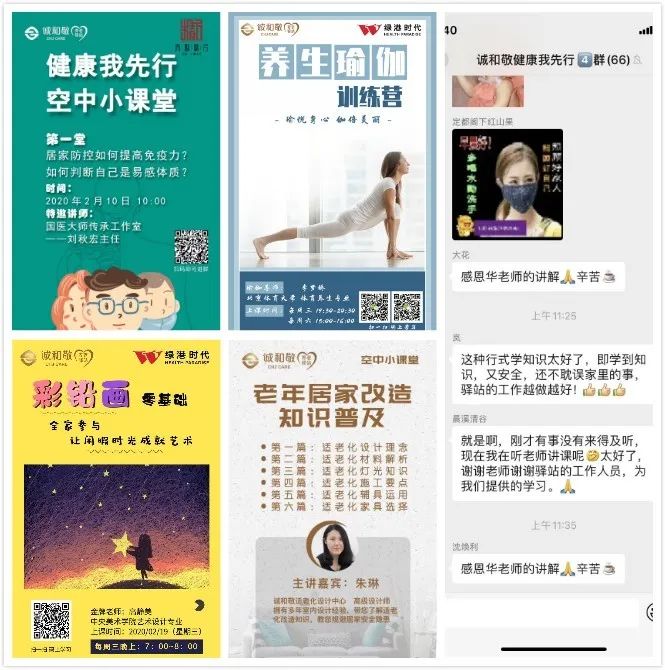 誠和敬組織制作了“翹首未來,共迎花開”空中詩會活動?;顒佑绅B(yǎng)老一線工作者、老人、朗誦愛好者等用視頻錄制的方式朗誦詩歌,用詩歌頌揚真善美,提振精氣神,匯聚正能量,為堅決打贏疫情防控阻擊戰(zhàn)加油鼓勁,目前已上線更新6期精彩節(jié)目。同步推出系列銀發(fā)精品課程,將以往深受老人喜愛的課程轉(zhuǎn)移到線上,邀請多位老師開設空中課堂,讓老人在疫情期間通過豐富的課程學習技能,居家隔離也能豐富多彩。目前針對老人的需求已開設“健康我先行”、“零基礎鉛彩畫和線描畫”、“養(yǎng)生瑜伽訓練營”、“隸書親子在線課”、“素質(zhì)英語”“適老化改造”等6類課程。自2月中旬以來,累計開課39次,服務老人12000余人次。