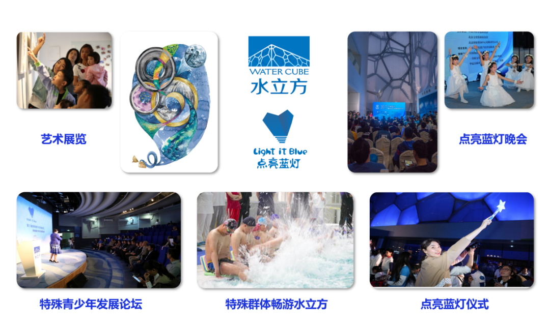 水立方自2011年起開始致力于倡導(dǎo)對自閉癥譜系障礙群體的關(guān)愛活動。十年來,水立方通過每年在4月2日這一天“點亮藍燈”持續(xù)為自閉癥譜系障礙群體發(fā)聲,與專業(yè)機構(gòu)協(xié)作,通過發(fā)起特殊青少年發(fā)展論壇、開放公益參觀游覽、舉辦特殊兒童藝術(shù)展覽、開展對特殊群體的公益游泳培訓等多種線下活動,用實際行動表達對自閉癥譜系障礙群體的關(guān)愛,并提供切實可行的幫助。
